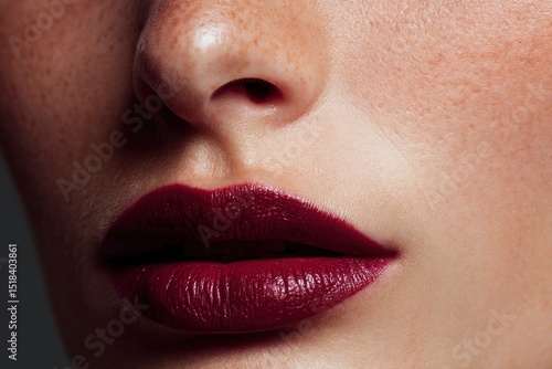 Closeup captures lips with dark red lipstick freckled nose and detailed skin texture