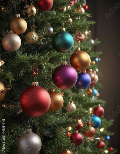 Close-up, colorful baubles adorn a richly decorated Christmas tree, twinkling lights , image, design element