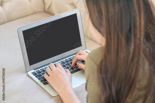 Closeup computer notebook on sofa with asian woman for work in lifestyle of woman concept