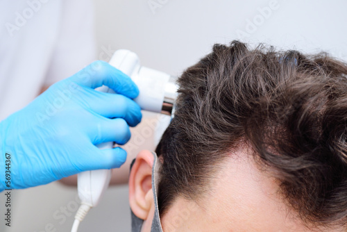 Close-up cosmetologist trichologist diagnoses the condition of the hair of a male patient with baldness using trichoscopy.
