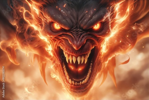 102, abstract, afterlife, ai, art, artificial, bible, burn, jesus christ, christianity, dark, day, death, daemon, devil, fantasy, fire, flames, generative, god, daemon, demonic, creature, face, sharp, teeth, fang, glowing, red, mouth, open, wide, smoke, fiery, background, sharpened, focal, point, image, colours, scheme, orange, yellow, intense, atmosphere, closeup, eye