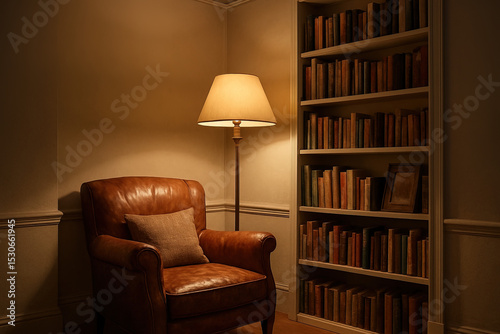 reading, nook, leather, armchair, lamp, bookshelf, cosy, corner, minimalist, vintage, ambient, lighting, interior, design, warm, soft, detail, closeup, stylish, elegant, classic, wood, shelf, comfortable, inviting, relaxing, peaceful, modern, retro, decor, architecture, quiet, space, textured, tasteful, glowing, light, furniture, moody, atmospheric, refined, inspiration, calm, lifestyle, charme, seating
