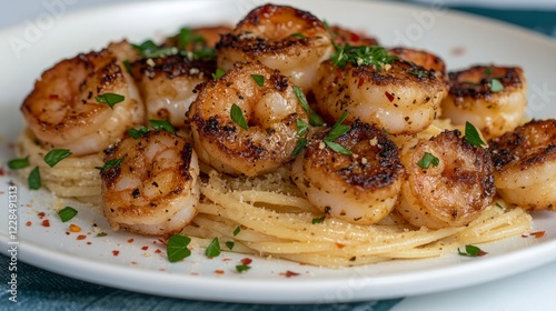 close-up food photography ,Italian cuisine,comfort food,home-made, Garlic Butter Shrimp Pasta with Parmesan and Herbs