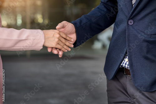 Closeup friendly meeting handshake between business woman and businessman with sunlight