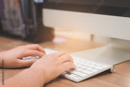 Close-up hand typing white keyboard on wooden table