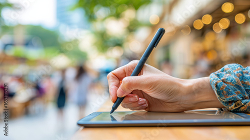 Closeup hand with stylus pen using digital tablet in bright outdoor