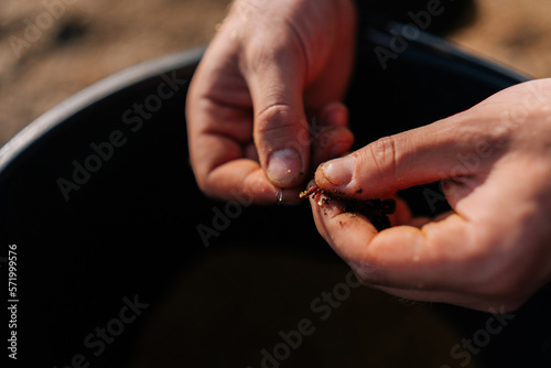 Close-up hands of unrecognizable fisherman preparing bait for fish sitting on river bank. Close up cropped shot of fisher male preparing fishing gear. Concept of lifestyle, leisure activity on nature