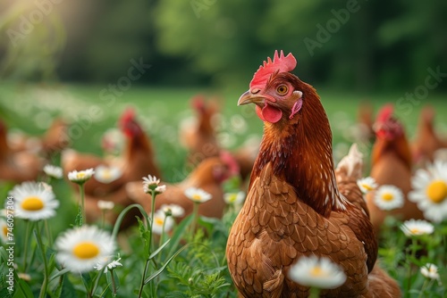 Closeup image of a brown hen standing out in a field filled with other hens and daisies, focusing on poultry farming