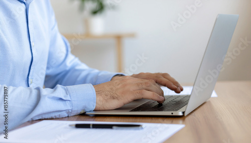 close-up image of a professional person typing on a sleek modern laptop at a wooden desk in a bright