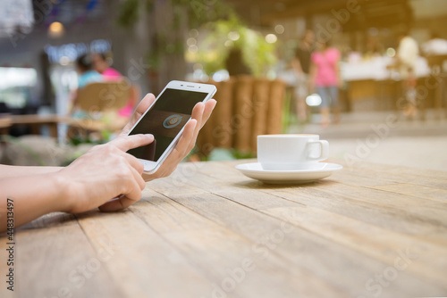 Closeup image of hands woman playing mobile phone. With a cup of coffee near On a wooden table in a coffee shop