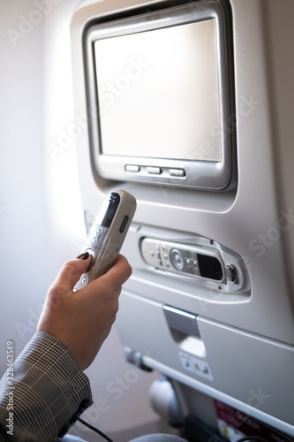 Closeup LCD rear seat on the plane technology for entertainment. Passenger traveling by a commercial aircraft controls by remote control entertainment system. Intercontinental flight.