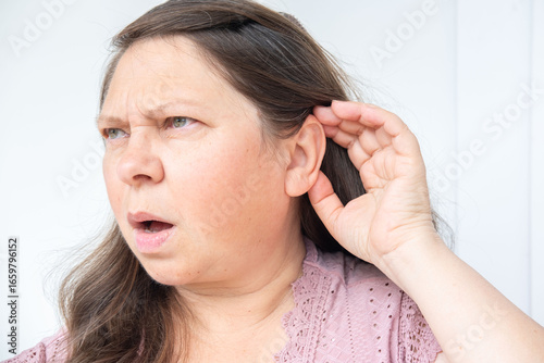 Close-up mature caucasian woman holding sore ear, listening carefully, hearing problem, poor hearing, health issue, attention concept, Ringing, tinnitus, Inflammation middle ear, acoustic trauma