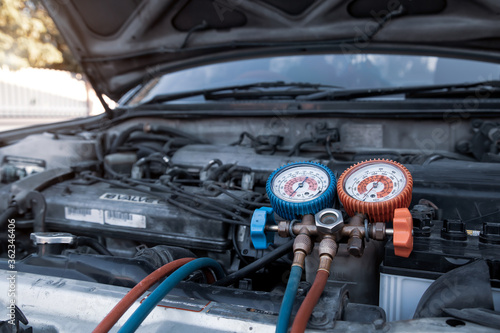 Close-up measuring equipment tool for filling car air conditioners fix checking. Concepts of Old car Repair service and insurance.