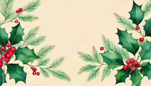 close-up Minimalist watercolor holly leaves and red berries, scattered on a light seamless pattern card