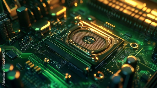 Closeup Modern Computer Motherboard CPU Processor Green Gold Technology Digital Circuit Board High Tech Electronic Hardware Detailed Design Innovation