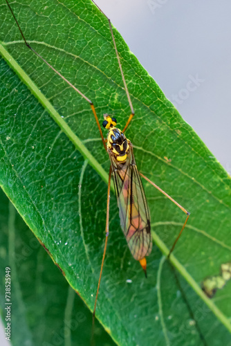 Closeup Nephrotoma crocata, a long-legged yellow insect with beautiful patterns on a green leaf in the close-up