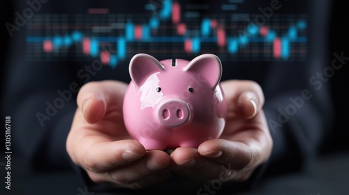 Close-up of a banker hands protecting a piggy bank with financial charts in the background.