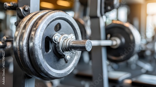 Close-up of a barbell and weights in a gym.