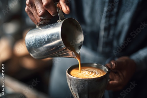 Close-up of a barista pouring milk into espresso to create latte art, highlighting skill, warmth, and craftsmanship in coffee making.