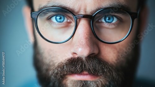 Closeup of a Bearded Man with Blue Eyes and Glasses Against a Soft Background for Modern Visuals and Marketing Use
