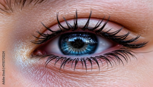Close-Up of a Beautiful Blue Eye with Long Lashes and Natural Skin Texture Reflecting Light