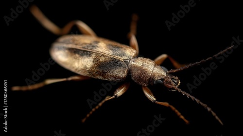 Close-up of a beetle, specifically a beetle. the beetle is facing towards the right side of the image, with its head slightly tilted downwards.