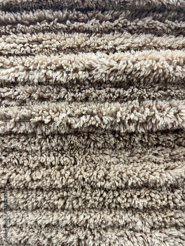 Close-up of a beige shaggy carpet or rug with thick, layered fibers creating a soft, fluffy texture and horizontal ridges, ideal for cozy interior design backgrounds.