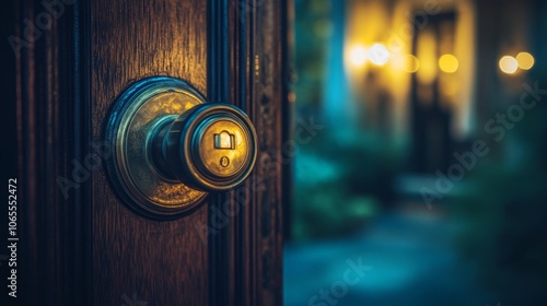 Closeup of a Brass Door Knob on a Wooden Door with Blurry Background