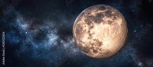 Close-up of a bright yellow moon illuminated against a dark night sky with scattered stars and a hint of the Milky Way in the background.