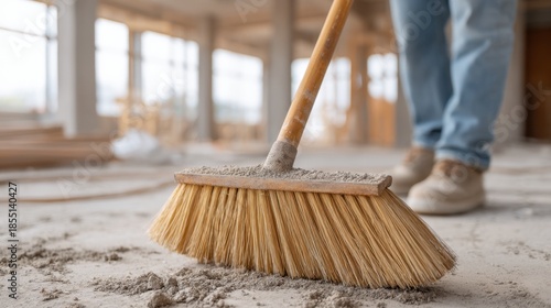 Close-up of a broom sweeping dust on a construction site floor, showcasing the importance of cleanliness during renovation and building projects