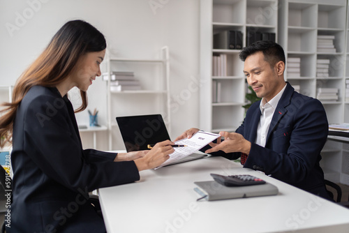 Close-up of a businessman shaking hands with a young Asian female, Work with document in the office.