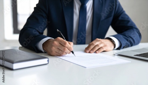 Close-up of a businessman's hand signing a corporate contract on a document at an office desk