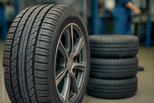 Close-up of a car tire with detailed tread pattern and metallic rim near a stack of tires and a blurred mechanic in a garage.