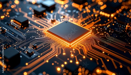 central processing unit, processor, circuit, board, technology, electronic, digital, computer, hardware, microchip, integrated, system, glowing, orange, dark, complex, intricate, connection, pathway, illuminated