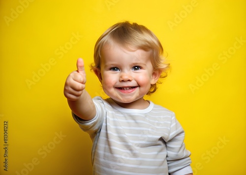 Close-up of a cheerful toddler with blond hair showing thumbs up against a vivid yellow background