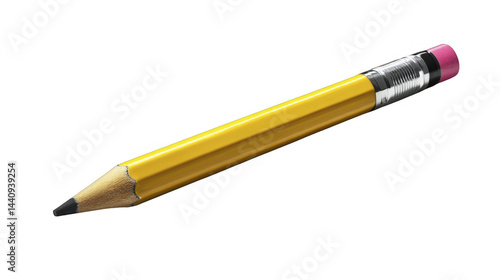 Close-up of a classic number two yellow pencil with a sharp point and pink eraser, positioned diagonally across frame on a transparent background, PNG image, PNG file.