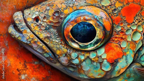 eye, fish, macro, colourful, texture, skin, scale, iridescent, vibrant, blue, green, orange, yellow, red, gold, abstract, nature, aquatic, animal, detail, pattern, beautiful, art, photo, wildlife, underwater, exotic, tropical, water, life, round, shape, shiny, glossy, smooth, rough, dark, light, bright, contrast, sharpened, blur, background, surface, depth, perspective, beauty, natural