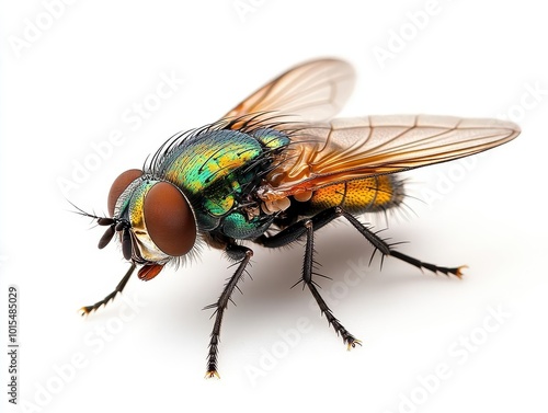 close-up of a common green bottle fly, isolated against a clean white background, showcasing intricate details of its iridescent body and delicate wings, emphasizing nature's wonders