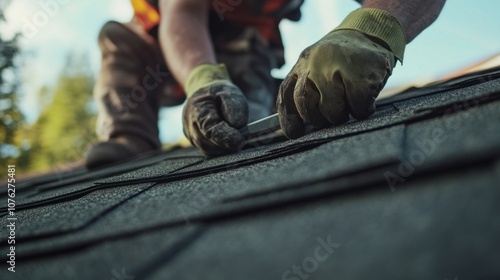 Closeup of a Construction Worker Installing Shingles on a Roof