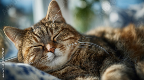 Close-up of a content tabby cat with brown and black stripes, eyes closed in relaxation, soft sunlight streaming through a window, fine fur texture visible, warm indoor ambience, c