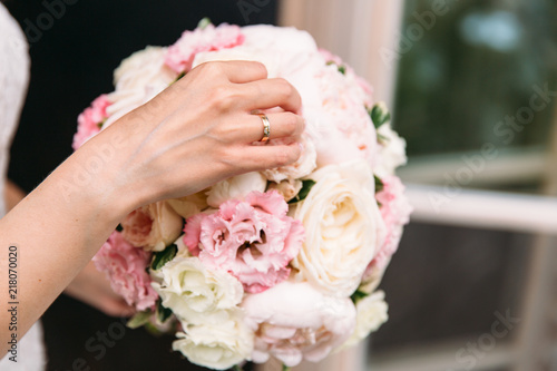 Close-up of a cropped frame, the bride in a white dress is holding her wedding bouquet of peonies, showing flowers to the camera. Wedding day, bouquet of the bride.