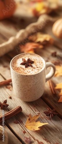 cup, hot drink, wooden, table, white, speckled, pattern, handle, topped, generous, whipped, cream, star, anise, cinnamon, stick, scattered, background, autumn, leaf, pumpkin, creating, warm, cosy, atmosphere, mood, inviting, photo, nature, design