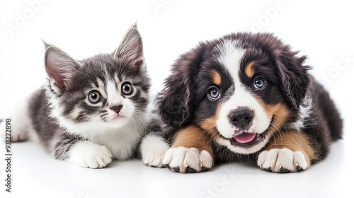 Closeup of a cute kitten and Bernese Mountain Dog puppy laying on a white background.