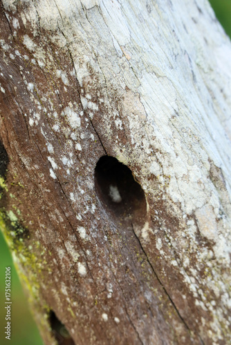 Close-up of a dark hole in old weathered deadwood with lichen and rough texture