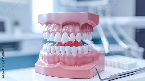 Close-up of a dental model with a set of perfect white teeth displayed in a dental clinic.