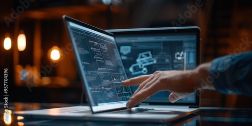 Close-up of a designer's hand adjusting website layout elements on a laptop screen