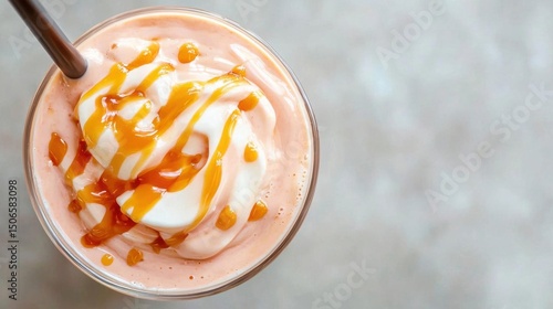 dessert, glasses, smoothie, milkshake, colours, creamy, texture, dollop, whipped, cream, drizzled, caramel, sauce, dripping, side, creating, effect, grey, textured, surface, black, straw, visible, right, corner, photo