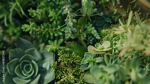 Close-up of a display of succulents, varied shapes and rich green hues, soft natural light, detailed and textured.