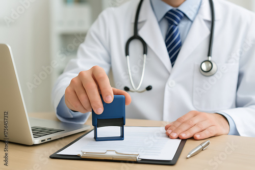 Close-up of a doctor's hand stamping a health document or insurance form with a rubber stamp on a desk with a laptop and pen