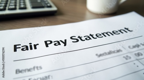 close-up of a fair pay statement on a desk, highlighting the equitable salary figures and benefits, with a calculator and a coffee mug in the background